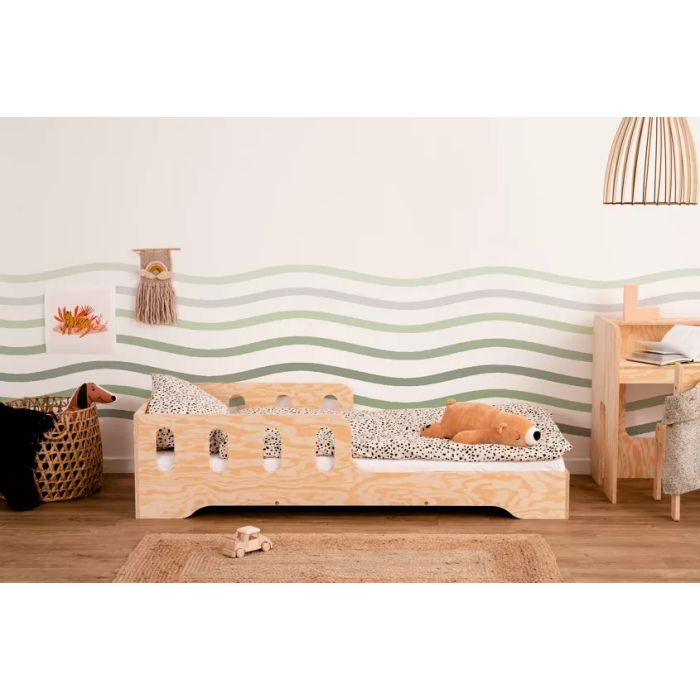 Introducing our Scandinavian Wooden Floor Bed for Kids with Safety Barriers from Ebbe series, featuring a convenient left-hand side entrance. This charming and secure bed combines the timeless elegance of Scandinavian design with thoughtful safety features. Crafted from high-quality pine plywood, it provides a cozy and accessible sleeping space for your child, making bedtime routines a breeze. The low-profile design of the bed ensures that it sits close to the ground, reducing the risk of injuries associated with traditional high beds. This feature also encourages independence as children can safely climb in and out of bed on their own. The bed features easy-to-access design which encourages children to use it without adult supervision and boost their independence. Enjoy peace of mind with the integrated safety barriers while adding a touch of Nordic style to your child's room. Upgrade your child's sleep experience with our Scandinavian Wooden Floor Bed today. Ebbe 5 bed is covered by water paints (one base coat, two main coats of paint). It is safe for children - it does not contain irritants and does not cause allergies.