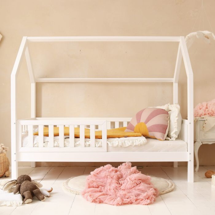 BIANCO PLUS house bed, a Scandinavian-inspired masterpiece, flawlessly blends design and functionality. When purchasing a BIANCO PLUS house bed, you will receive a complete bed frame with mattress frame, vertical beams, a roof, drawer frame and a set of railings visible in the photos. All necessary assembly elements, such as screws and water glue, are also included.