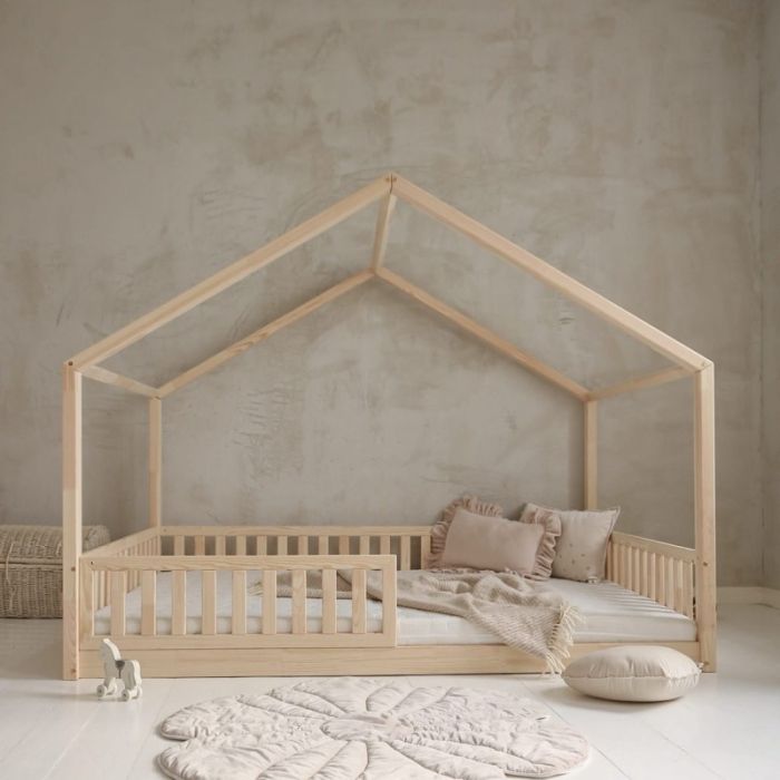 Kiddirooms Shop’s charming, Scandinavian-style house-shaped children's bed is a delightful and one-of-a-kind sleeping haven for your little one. With the purchase of a Flori wooden house bed, you will receive the elements shown in the picture: a complete bed frame with a mattress frame, and assembly elements (screws, dowels, and water glue), which are necessary when assembling the bed. Entrance to bed: • Removable universal front barrier.