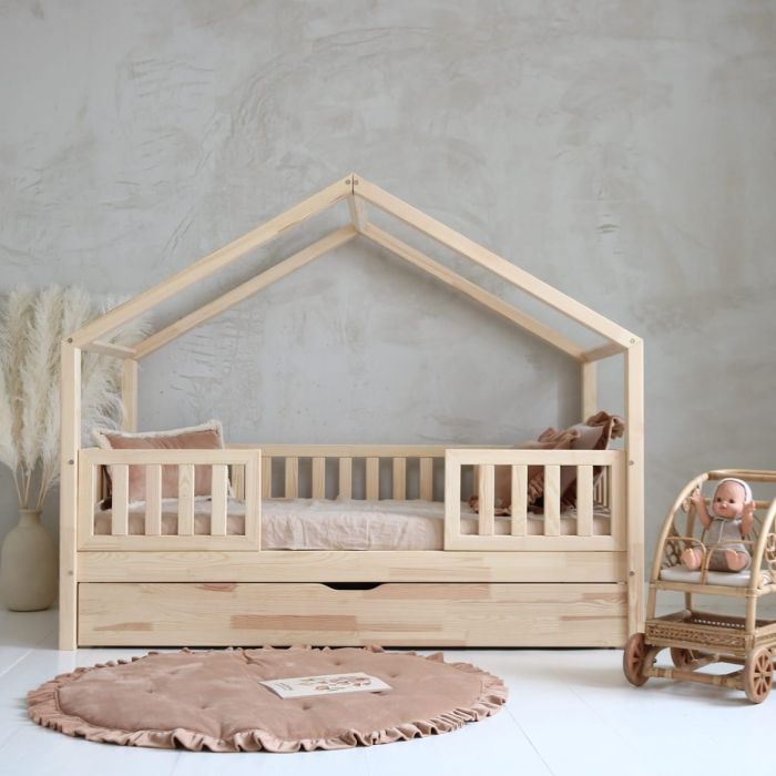 Housebed Duo Plus is a Scandinavian-inspired masterpiece, flawlessly blends design and functionality. When purchasing a wooden house bed, you will receive a complete bed frame with mattress frame, vertical beams, a roof, drawer frame and a set of railings visible in the photos. All necessary assembly elements, such as screws and water glue, are also included.